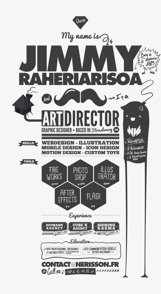 This CV has a mood board, casual feel to it with the added illustrations but gives a sense of personality to the design. The designer has stuck to black and white to counterbalance the "busy" layout.
